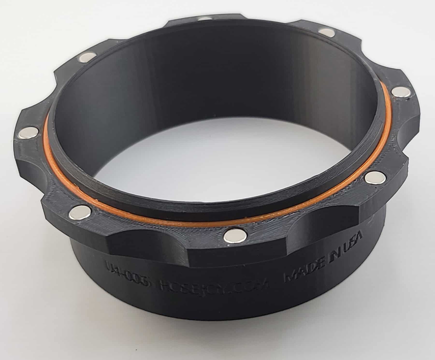 This magnetic 4 inch tool port adapter is part of the HoseJoy magnetic hose connector system, providing a fast, frustration-free way to move a 4-inch flex hose between tools without clamps, screws, or fiddly fittings.